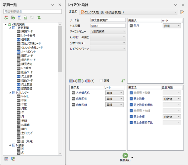 そして集計実行することで得られるデータの明細を表示した結果表を指します。