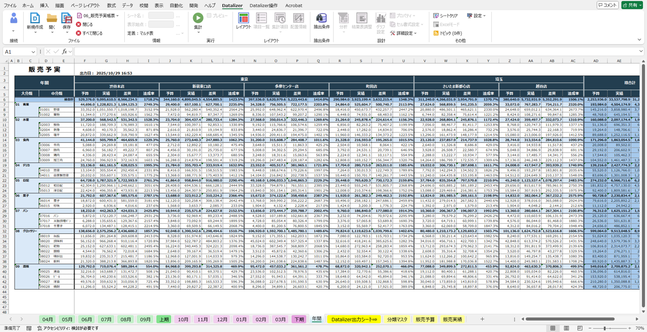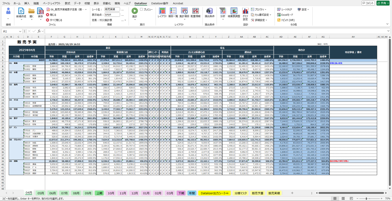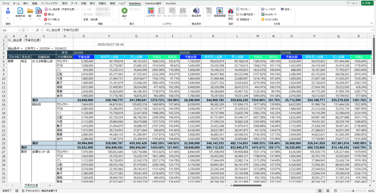 例えば「予算データから販売予算」の集計定義を「実績データから販売実績」の集計定義を作成し、それらファイルを組み合わせた結合表があります。この「結合表」では集計結果をExcelに描写する際にExcel関数の"VLOOKUP関数"のようにデータを自動的に組み付けて1つの結果表で出力してくれるのです。