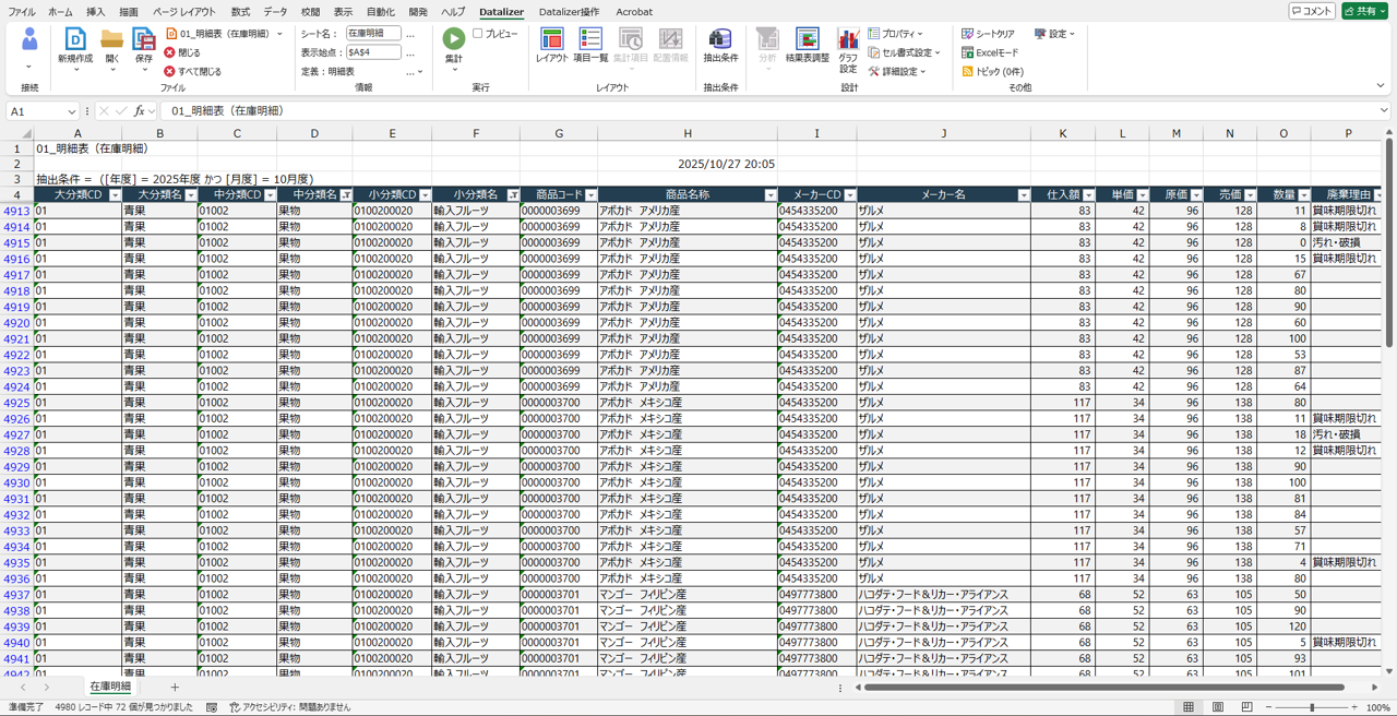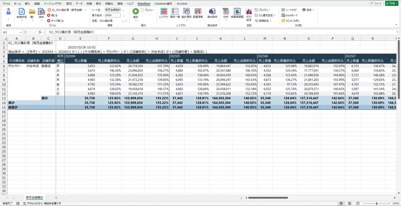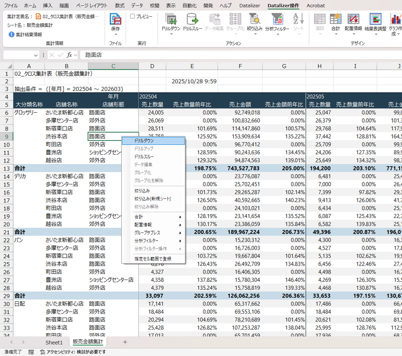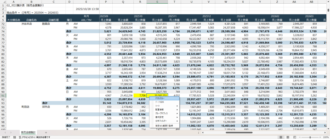 そして[ドリルダウン]指定後には再度集計が実行され、「商品大分類・店舗・曜日ごと」でデータ分析が実現できました。