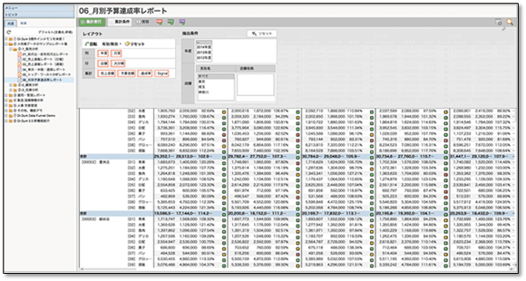 通常は異なるデータテーブルから1つの結果表とするためには、予め集計するためのデータを専用に作成する必要があります。しかし「結合表」の機能によって、そのようなデータ加工処理を省けるため、ITの専門知識が高くなくても異なるデータテーブルから1つの結果表を作成することができるのです。またDatalizerの[事後計算]を使用することで、「予算に対する進捗(販売実績/販売予算)」も特別なデータ加工処理なくカンタンに計算させることもできます。