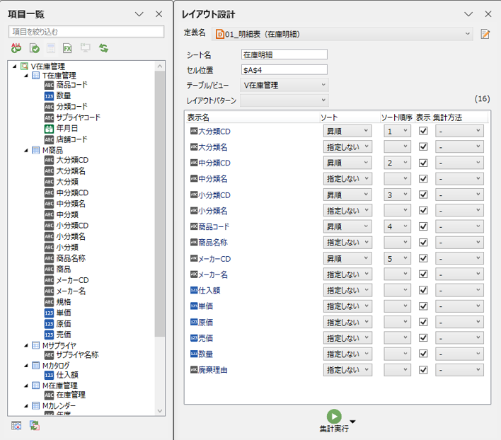 利用可能な項目の一覧からデータ出力したい項目を[レイアウト設計]へドラッグ&ドロップで配置します。
