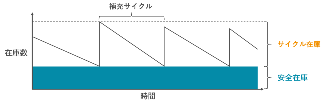 まず、適正在庫とは、欠品を起こさず過剰在庫でもない最適な在庫数のことを言いますが、適正在庫は「安全在庫」+「サイクル在庫」で構成されています。