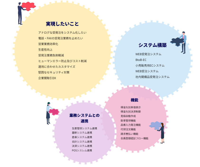 業界・業種毎に、これまでの商習慣が異なりますので、それぞれの必要条件を丁寧にヒアリングし、システム構築を行っていきます。
