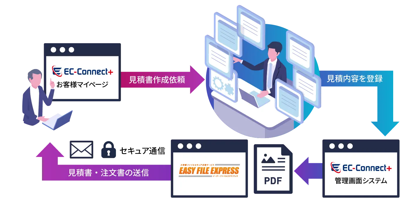 - BtoB-ECサイトを開設し、Web上から見積もり依頼を受付、営業担当者は管理画面から金額登録を行うことで、見積書と注文書がシステム上から自動出力。