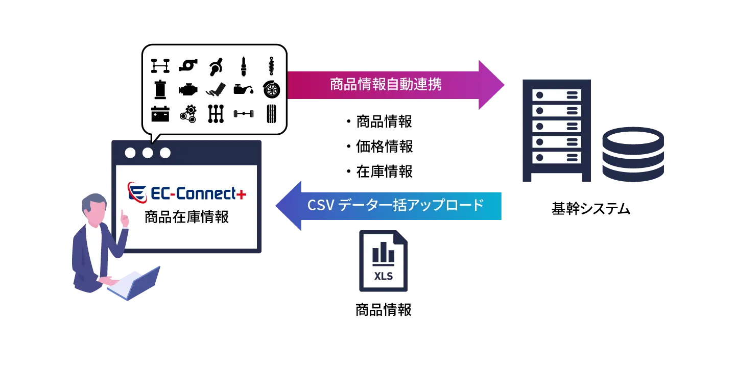 - EC-Connect+BtoBでは、基幹システムと商品情報を自動連携。商品在庫数や金額をサイト上で、社員の誰もが、すぐに確認が可能。