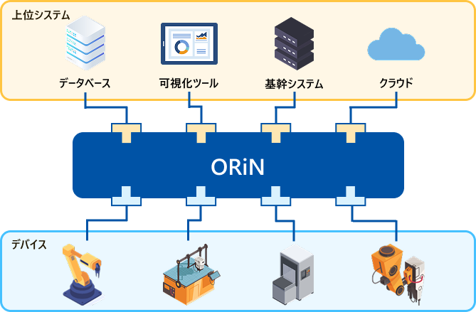 各デバイスの様々なデータ通信規格を統一の ORiN規格に変換し、上位システムと連携できます。